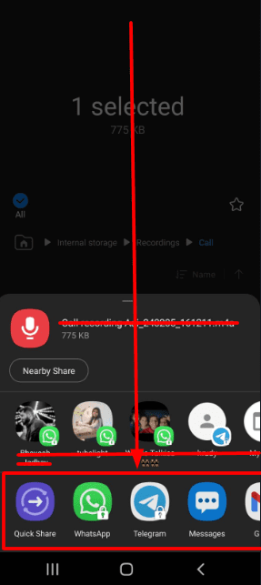 6. Click on it, and you can share the recorded call via messaging apps like WhatsApp, email, or Google Drive.